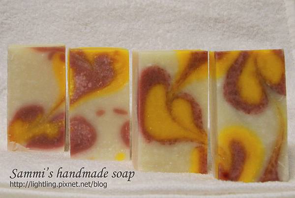 這次做渲染皂時,弄得太濃稠才入模,且乳油木果脂在二次升溫時因溫度上升太快呈現顆粒狀,脫模後老師說皂算成功,依然是好洗的皂。打皂時所遇到的失敗點也算是一次學習經驗,希望下次更好。