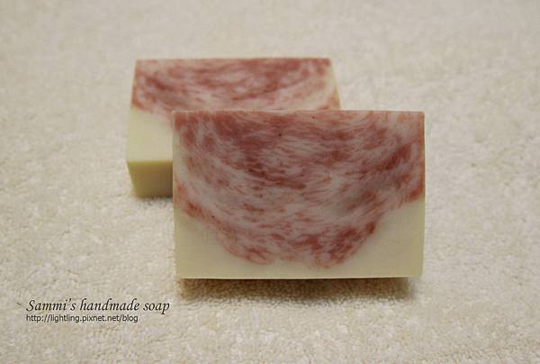 成份:椰子油、棕櫚油、橄欖油、蓖麻油、甜杏仁油、純水、茜草粉